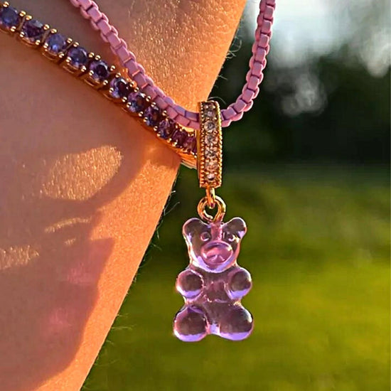A Pre-Made Featured Flavor From Gummy Bear Bling Featuring Blue & Pink Gummy Bear Pendants On An 18" Box Chain Necklace